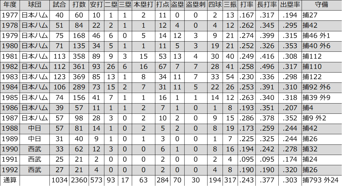 経歴 :享栄高校-駒澤大学-日本ハムファイターズ(1977~1987)-中日ドラゴンズ(1988~1989)-西武ライオンズ(1990~1992)